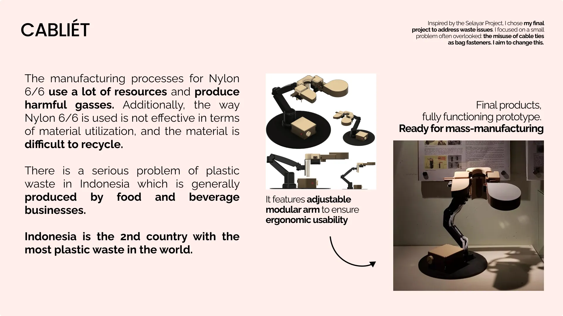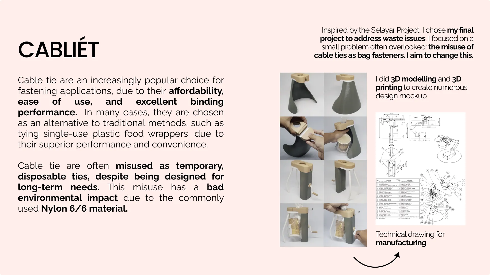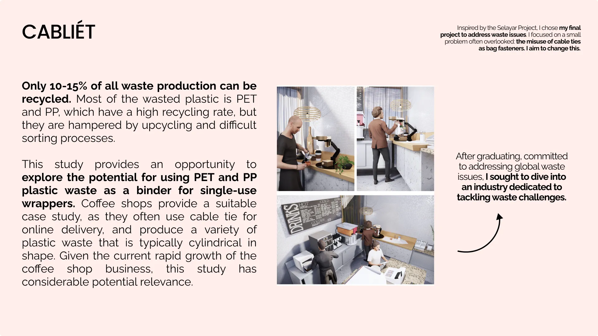 During my final college project, I explored the potential for using PET and PP plastic waste as a binder for single-use wrappers. Coffee shops provide a suitable case study, as they often use cable tie for online delivery, and produce a variety of plastic waste that is typically cylindrical in shape.