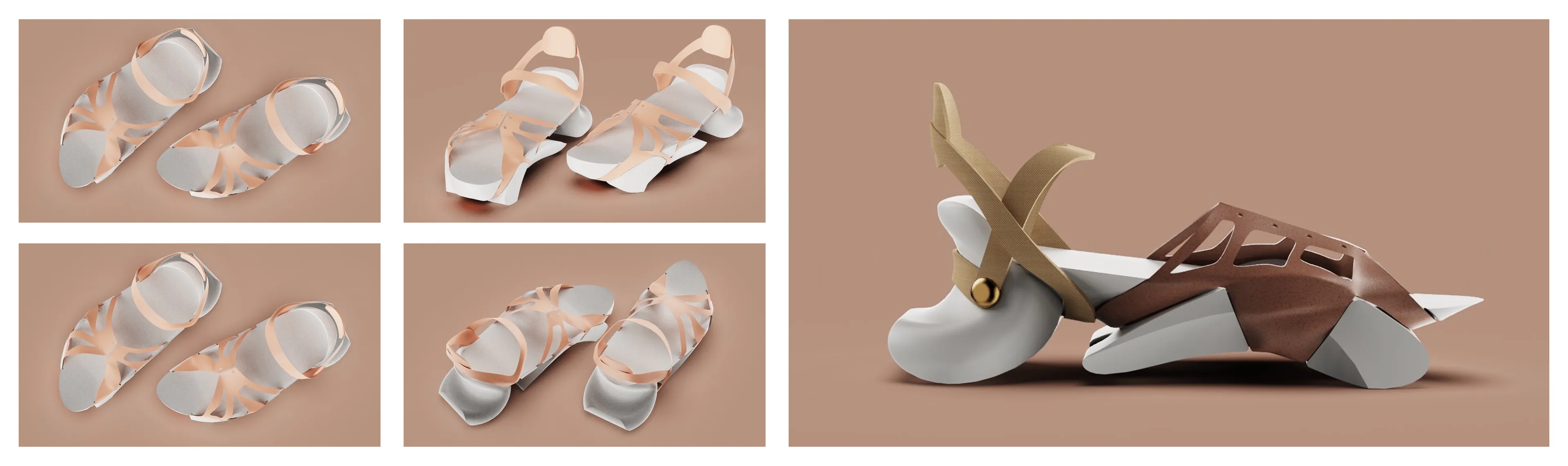 4. Final design render For the final stage I brought the chosen design into KeyShot and set it in a warm neutral scene so the focus stayed on the shoe. I rendered top, three quarter, and side views to study how the straps wrap the foot, how the sole meets the ground, and how the stone like base and leather cage relate. I used soft highlights on the sculpted sole and a matte finish on the upper to estimate how the shoe would appear under runway spotlights. It served as a clear reference for Adrian and the production team and marked the point when the design was ready to move into fabrication.