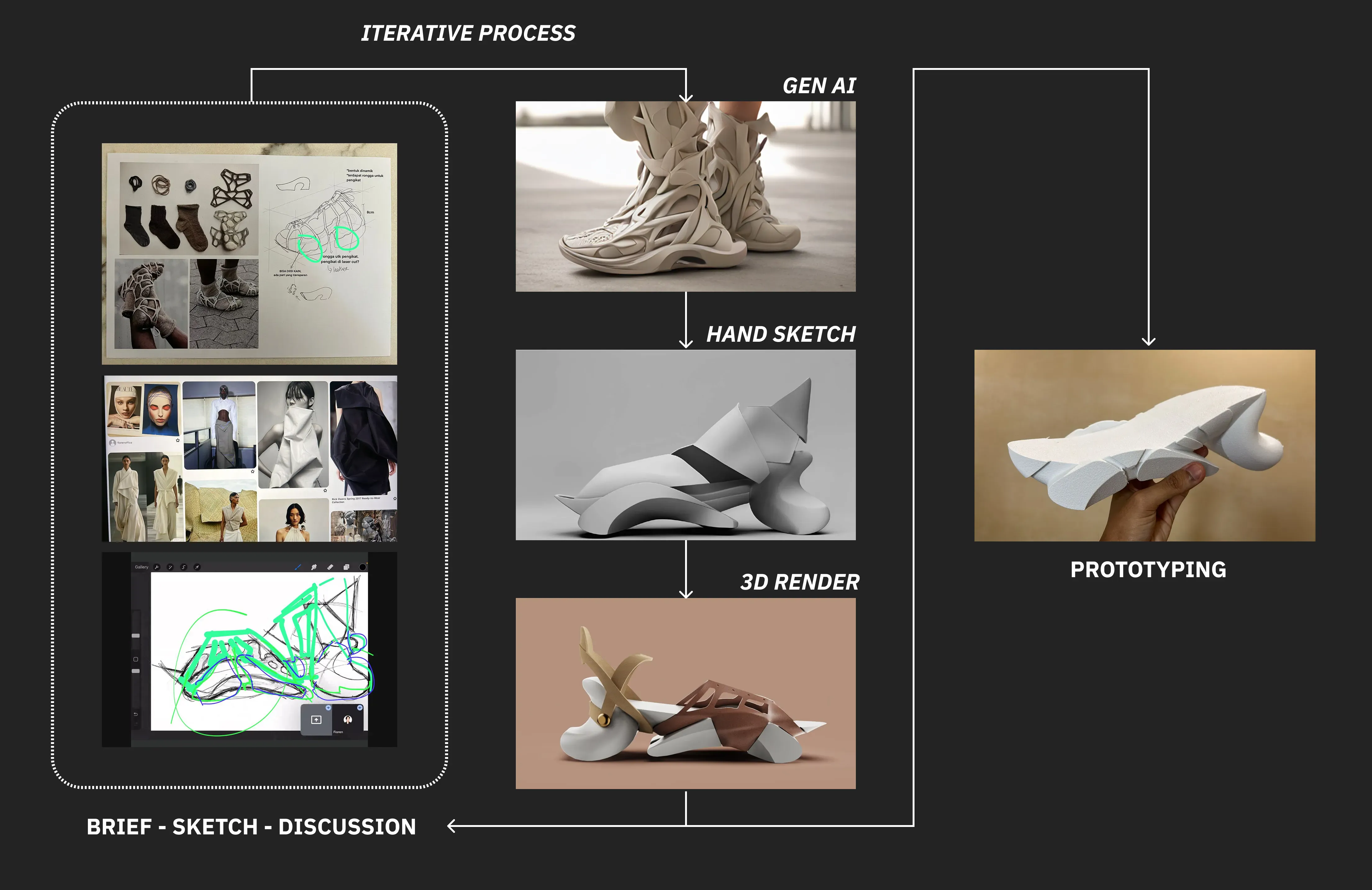 I learned that my ideas sit inside a very specific manufacturing reality in Indonesia. Experimental, small batch footwear with unusual structures is hard to produce here, and I did not study that limitation early enough. If I had mapped local factory capabilities, minimum quantities, and comfort standards at the start, I could have framed the design in a way that matched what was actually possible.
