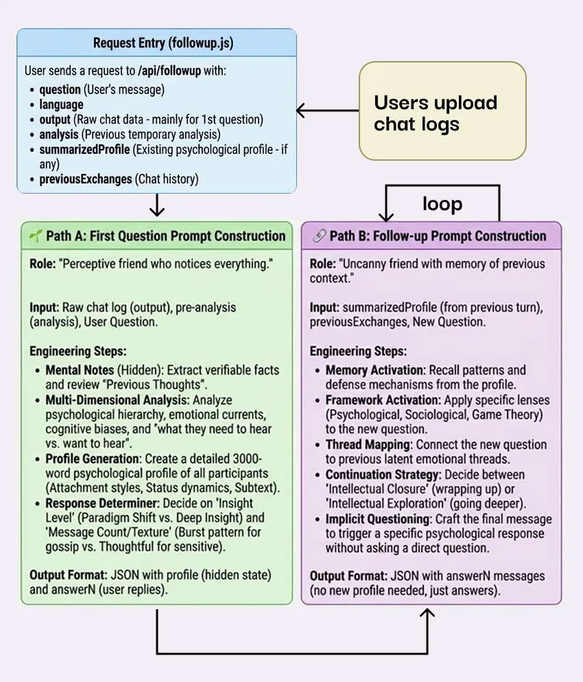 Second, I let the model to imagine that they're more like a perceptive friend from the group chat. The prompt tells the model to think in two stages.