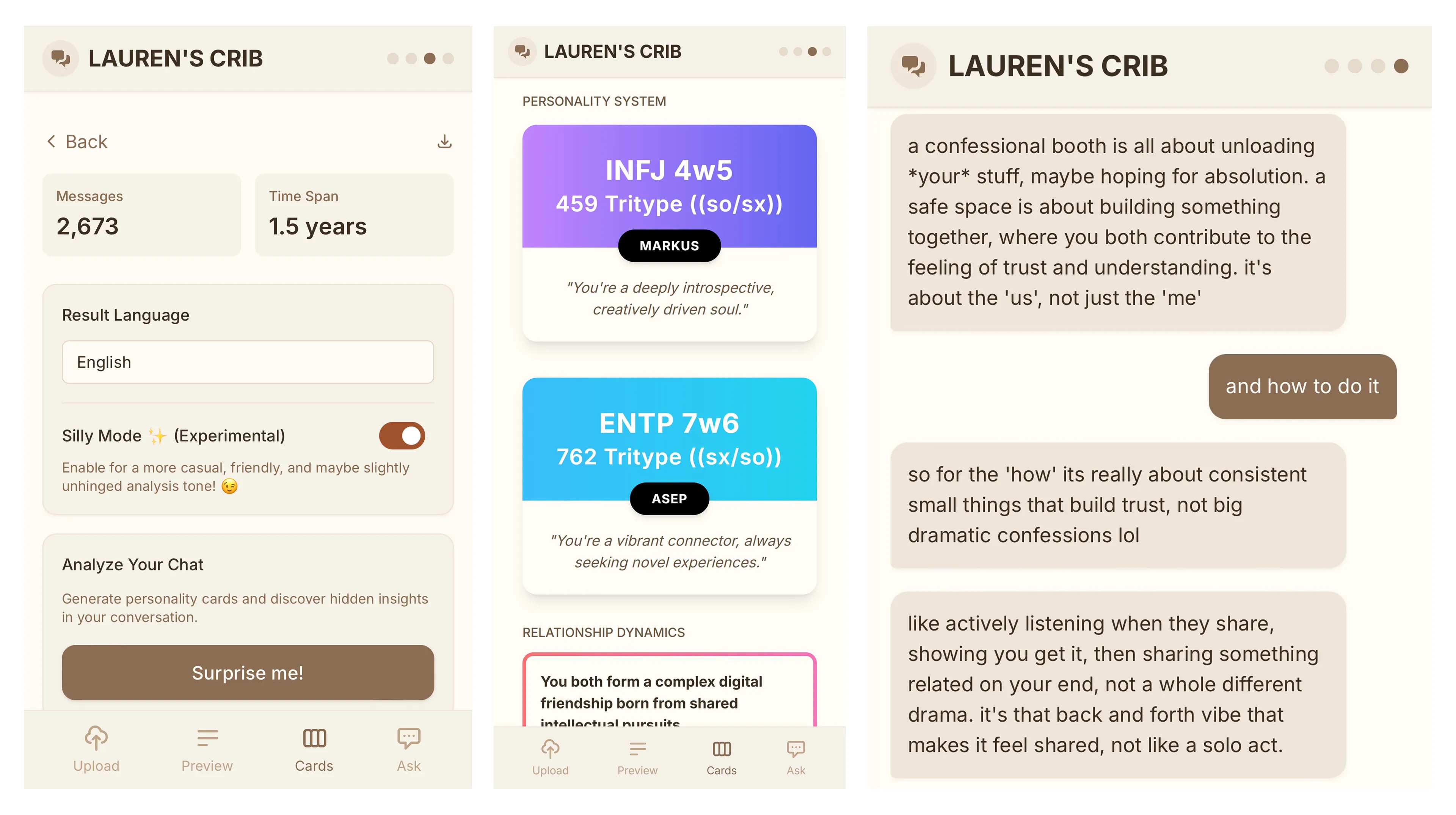 Lauren’s Crib shows the analysis as a series of simple panels so people can read heavy psychological content like they scroll a friend’s recap.