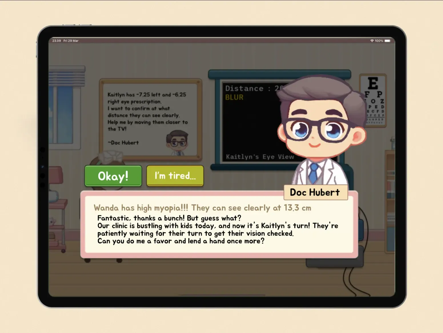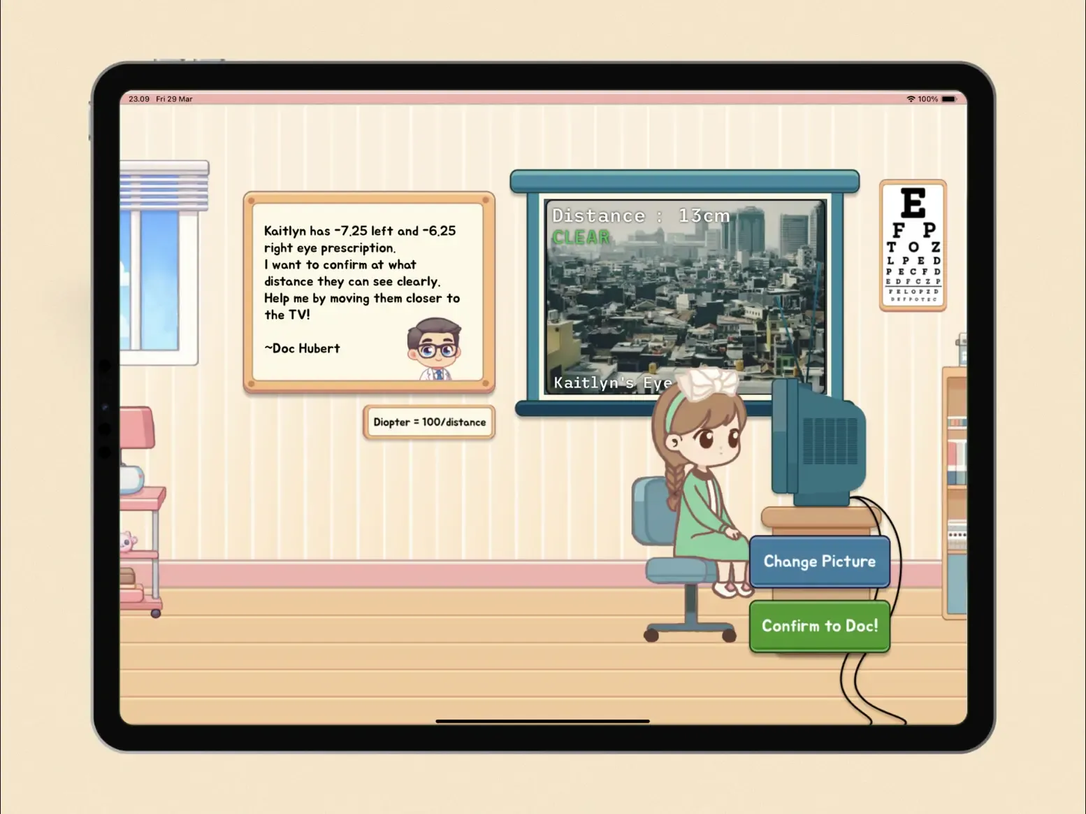 Through MyopiaSim, kids can experience visual impairment and learn to take better care of their eyes before it's too late, with a gamified approach like a conversational game in a step journey to make it kid-friendly.