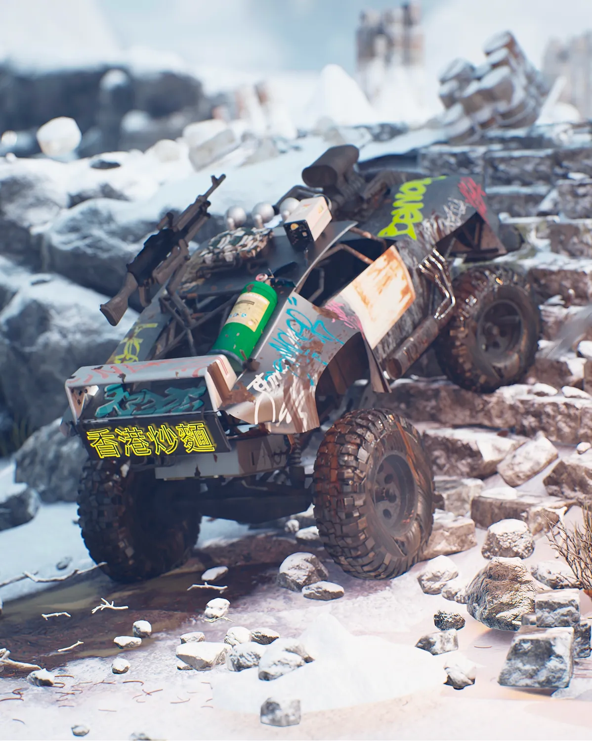 Built to endure freezing temps, radiation, and bioweapon-spawned mutants, it features a 1-meter raised chassis with monster tires, an 800HP diesel engine running on pirolysis oil, and insulated armor from repurposed Chinese muscle cars. Remote operation enables zombie extermination from bunkers.