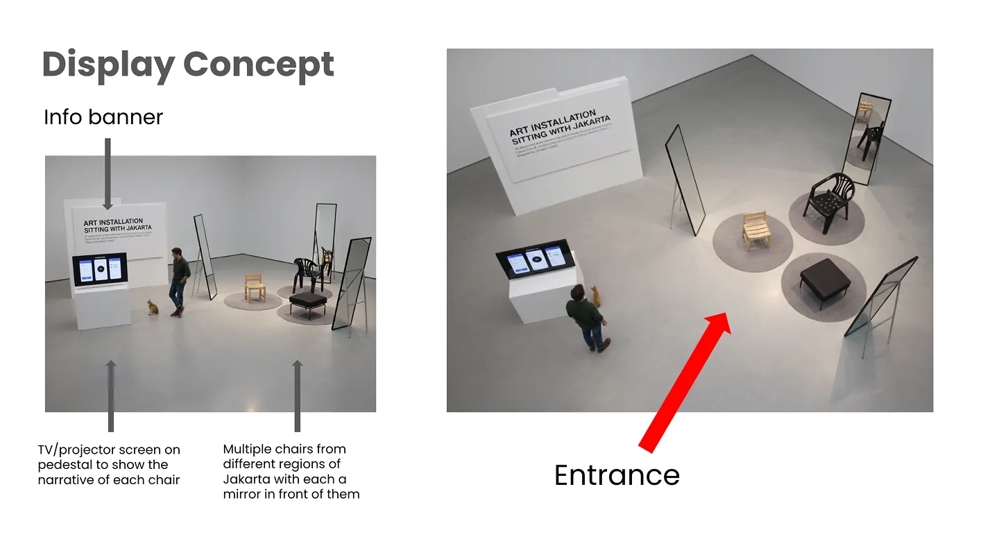Spatial Layout A visitor enters and first sees a row of worn Jakarta chairs presented almost like portraits. Each chair faces a mirror that hides a webcam behind two way glass, so the mirror works both as reflection and as sensor. A small trigger button sits near each chair as capture trigger. On one side of the room the chairs and mirrors form an intimate zone where one person at a time can sit and look back at themselves with the object. On the opposite wall a projector throws the generated narrative as a slide show, so the story is visible to everyone in the space. The blocking keeps the chair, the human body, the mirror, and the projected text in one visual triangle, which turns the whole gallery into a conversation between person, object, and city.