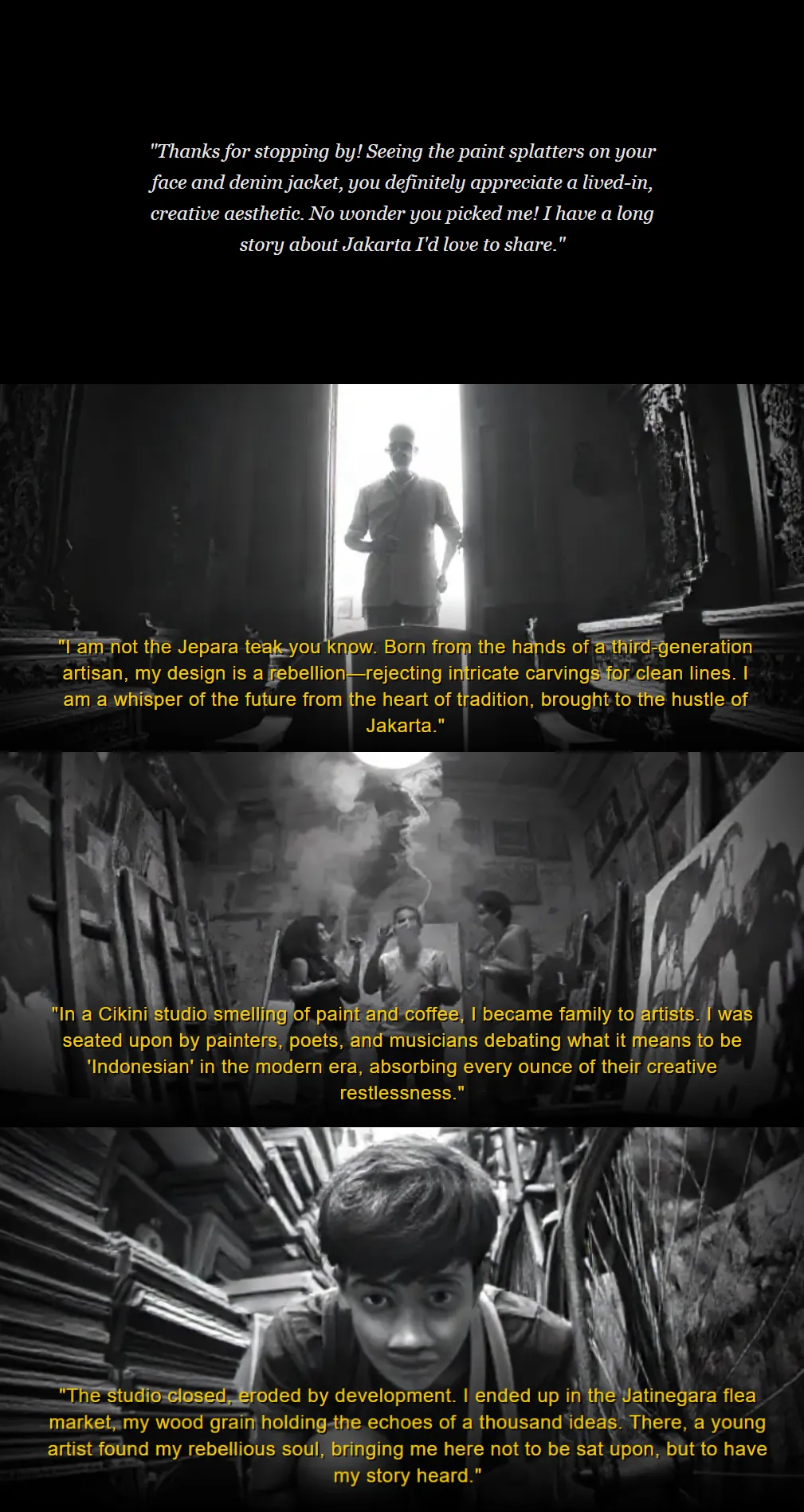 D. After a short pause, the narrative starts to appear on the projection wall as a sequence of slides, like a slow subtitle stream about the chair’s life in Jakarta and the new memory created with the visitor.