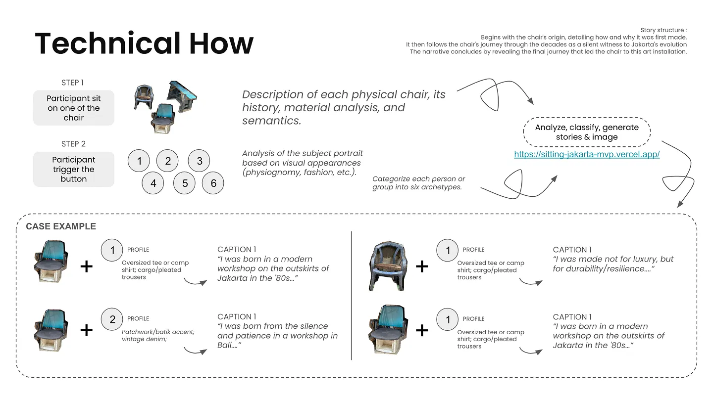 The second layer of the algorithm mixes that profile with a fixed profiling data that defines the personality of each chair type. Each chair has a small ontology that describes its typical locations, owners, and social meaning in Indonesia. The system feeds both the human profile and the chair identity into a storyteller agent that writes a six part autobiography. The timeline often runs from the chair’s “birth” in a workshop or factory, through different homes, shops, schools, small stalls, and finally to its late stage in storage or on the street. The writer agent aligns the user’s inferred background with plausible scenes in Jakarta. A middle class student might meet a bimbel chair in a cram school. A market worker might meet a plastic stool in a food stall. The output is strict JSON that includes six text slides plus six short image prompts.
